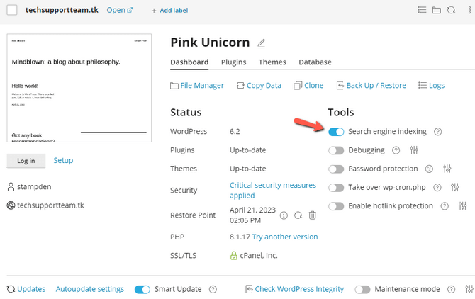 Suppose your website is not ready for the public, and you would prefer it if people can't access it for now. You have already turned on the Maintenance mode, just to be safe. However, your website is still getting traffic for some reason, even though you haven't told anyone about it. What is likely happening here is that search engines are indexing your website, and users are opening it at random because it appears in search results. Fortunately for you, the WP Toolkit comes with the option to discourage search engine bots from indexing your website. This way, your website will not appear in search results, therefore users won't find it randomly. You can find the switch to turn indexing on or off in the WP Toolkit dashboard for your respective site.