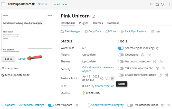 Sometimes we forget what a website's administrative password is. It happens to all of us, and we are all familiar with that feeling of helplessness from being unable to log into the website. The WP Toolkit is here to help! It is possible to generate a new administrative password for your admin user (and change the admin email) via the Setup button.