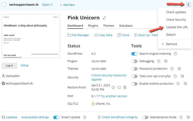 That can update the website's URL within the WP Toolkit. It is crucial to make this distinction here. It will not change the URL the website is currently using. It will only change the URL which appears in the WP Toolkit. Several methods exist to change a website's URL, all done outside of the WP Toolkit.