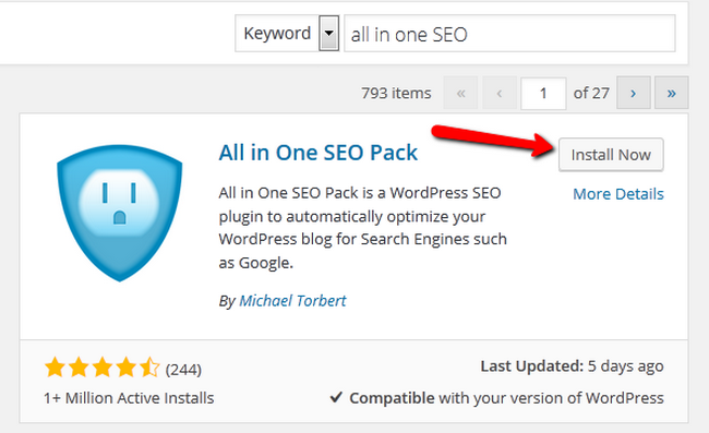 In the search bar type “all in one SEO” and after that click on the Install Now button.