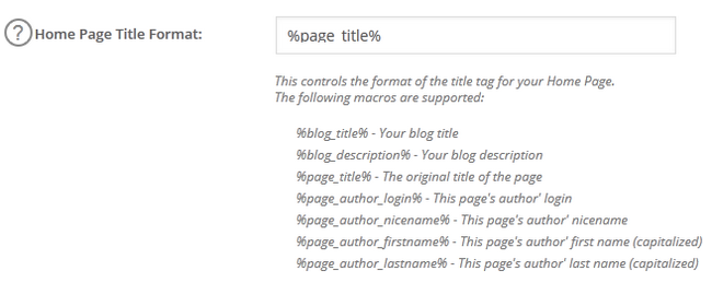 - Home Page Title Format – To change the format of your Page title and other titles below it, you will need to click on the “?”(question mark) icon for the supported formats and choose the one you see fit best