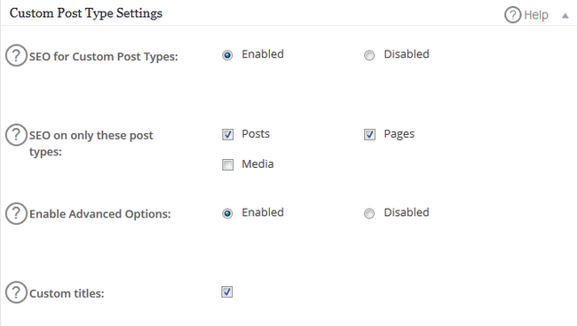 - SEO for Custom Post Types – Enabled by default, this option will make the All in One SEO work with any custom post types you may have on your website