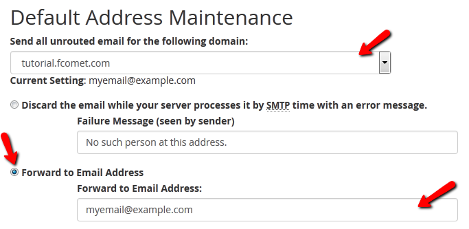 Default email address is another useful email related feature in cPanel. This tool allows you to configure a single email address to receive all incoming messages for your account. For example, if you would like to have several email addresses such as support@ sales@ billing@ but still you prefer to receive all incoming emails into a single email account, you can set it as default/catch-all address.