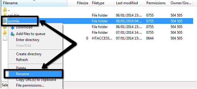 When you locate the folder of your Joomla installation, right-click on it and choose Rename option. Note that this may differ between the different FTP clients, so it is best to check the official documentation of the client that you are using for more details on that.