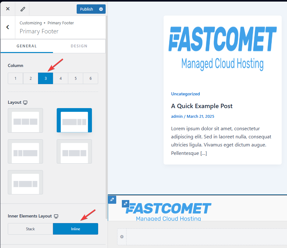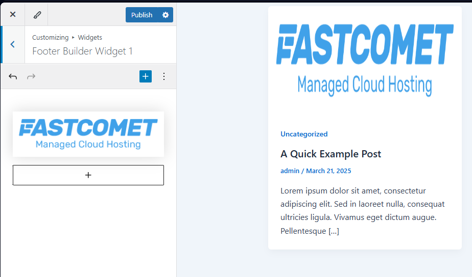 If you are not satisfied with the position of any of these footer elements, you can just go back to the Footer Builder and drag them around to where you need them. When ready, click Publish at the top to save your changes and apply the footer to your entire website. This is what ours looks like in the end.