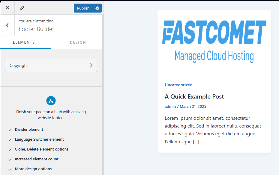 On the left, you will see the builder itself and it should currently have two tabs: Elements and Design. It should also have a single element called Copyright.