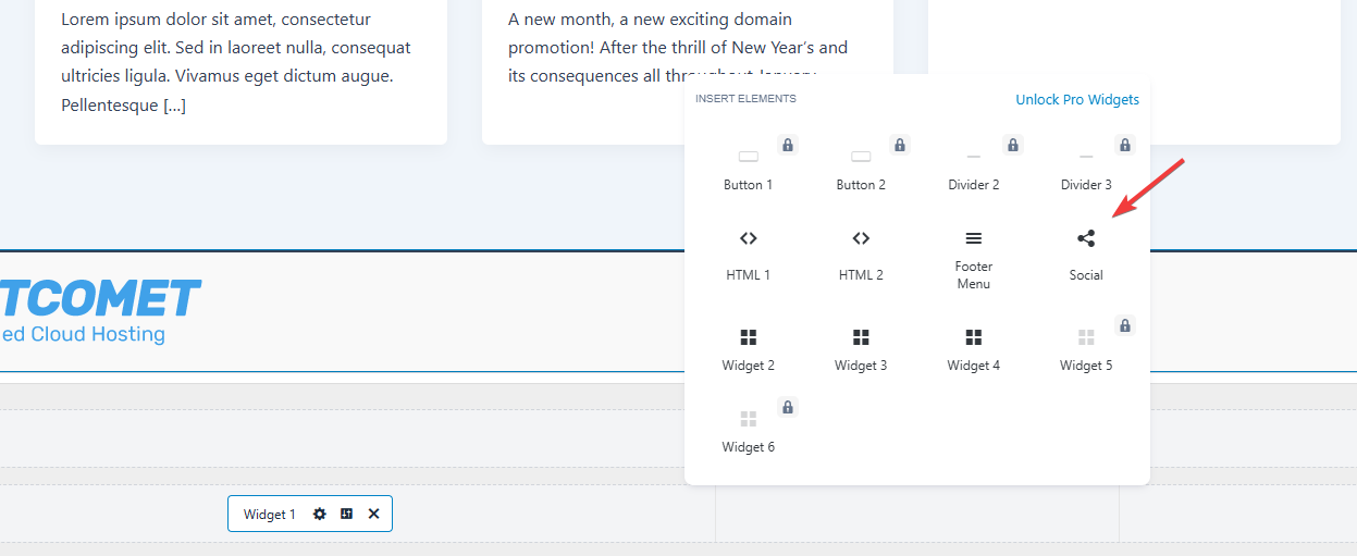 It will appear in the footer, where you can hover over it and click the pencil button to edit the image’s own properties. Feel free to play around with the various options you can change until you have it just right. Then, let us add some social media icons. The process is the exact same: click on the plus in our footer and select Social.