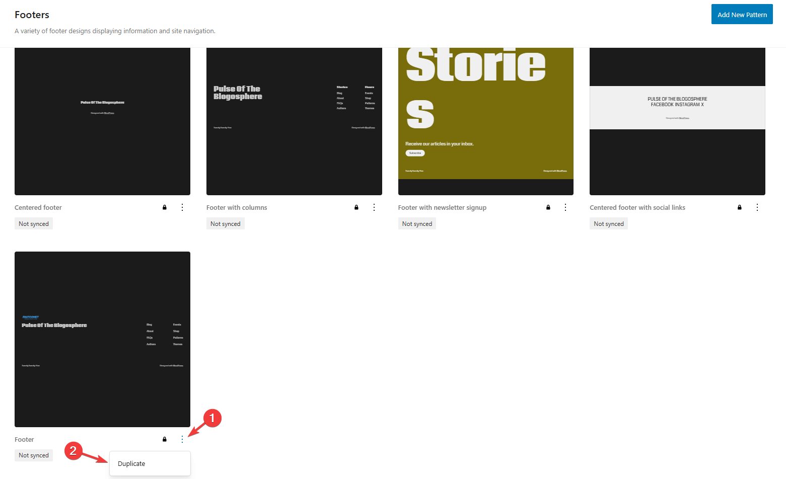 A window will pop up, so simply fill in the fields. Name your new pattern and assign it a category (Footers in our case). We recommend toggling it Synced. This will make it so that anytime you change this pattern in the Editor or in any of the pages it is in, those changes will apply throughout the website. Since this is a footer, a static element of our website, we want it to be consistent throughout the website. When ready, click Duplicate.