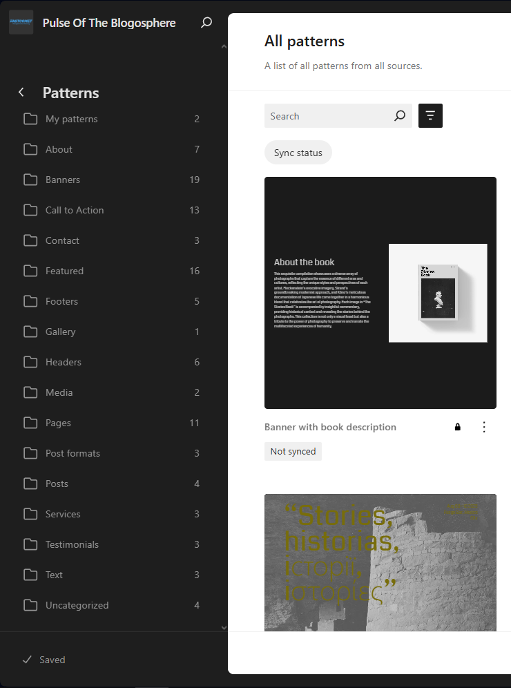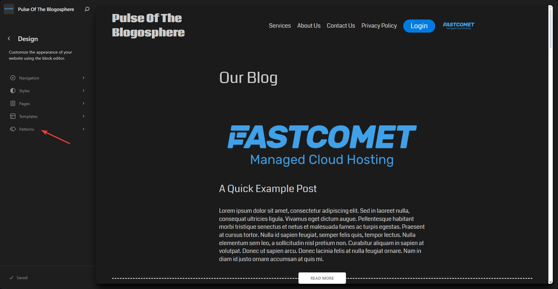 For now, though, we are interested in the Patterns section of the Editor. In the screenshot below, you will see Patterns on the left, but also our testing website on the right. We created the header in the previous part of this tutorial.