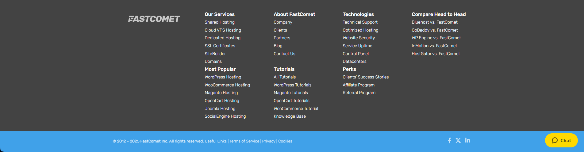 As you can see, it has a ton of useful links, including our services, information about our company, knowledge base, blog, and tutorial, to name a few. There is also a button for our live chat and links leading to our social media pages.