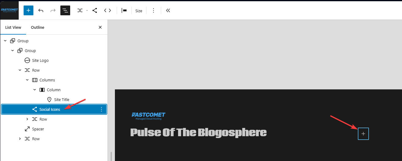 Clicking it will open a small window to search for blocks—type in your favorite social media platforms. We will keep it simple and add The Big Three. However, you will notice that the block is in the middle of nowhere. This is perfect because it allows us to showcase what we mentioned earlier. Simply drag the block to the position you want in the list on the left. We want it to be directly under our site title, so that is where we will put it.