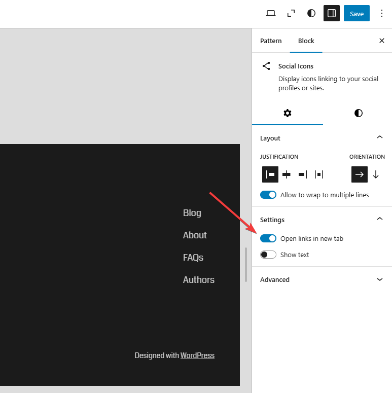 Great! Now, our website also has some social media links. However, we are not done yet. We must assign URLs to those icons; otherwise, they will lead nowhere. We also want the links themselves to open in a new tab. Click on the Social Icons block and on the right, you will see the block’s options: the first tab is for its general settings, and the second is for its style. In the style tab, we can change how the social media icons appear, the spacing between them, etc. However, for now, we only care about this toggle in the settings tab.
