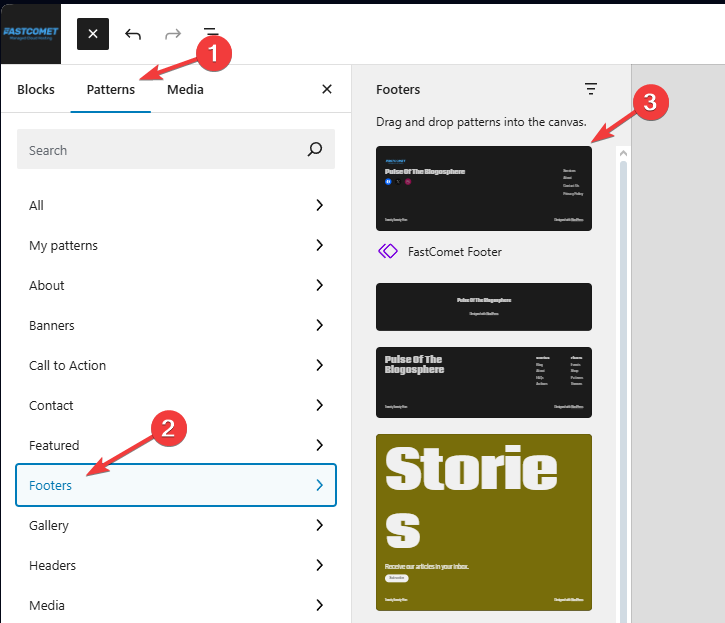 As you can see, there are many patterns for all sorts of things: pages, posts, headers, footers, galleries, contact us, etc. These are pre-made collections of blocks that you can simply pop into your page or post. Here, let us show you how it works. Head over to the Footers patterns so we can have a look.