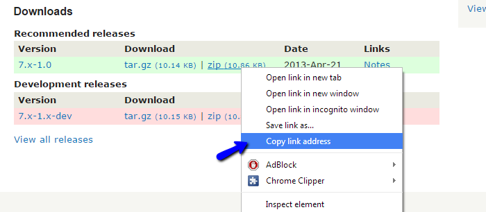 The easiest way to install the Clef two-factor authentication module is from a URL. To get the URL to the correct module, you need to access Clef from the official Drupal extensions directory. Scroll down to the Recommended releases section and right-click on the tar.gz or .zip package. Then select the Copy link address option.