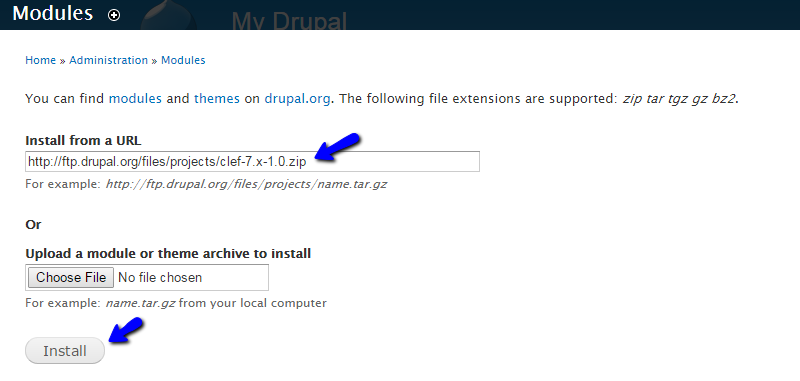 Go back to the Modules section on your Drupal website and enter the link address in the Install from URL field. Click on the Install button to initiate the process.