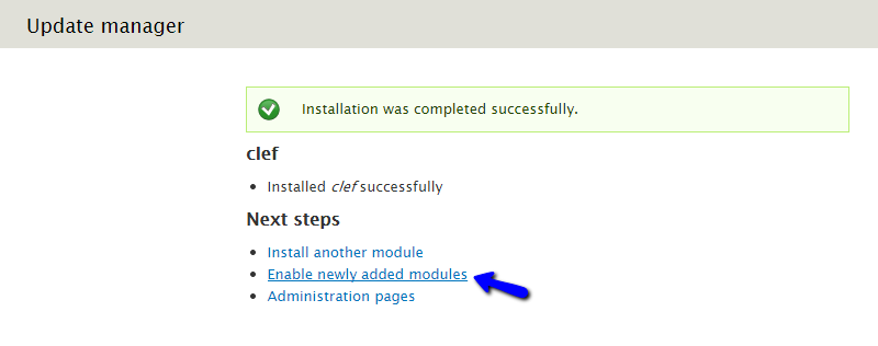 The system will install the module and then display a successful message on the screen. Click on the Enable newly added modules button to proceed.