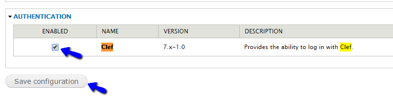 Locate the Authentication section and check the Enabled check-box, next to the Clef plugin. Click on the Save Configuration button to enable the module.