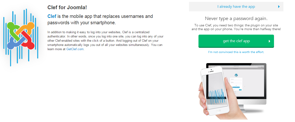 The Clef project has been discontinued on June 6, 2017, rendering this Tutorial Section out of date. To protect your Joomla website with Two-factor Authentication, you can use the new Two Factor Authentication option available from within the Joomla User manager.