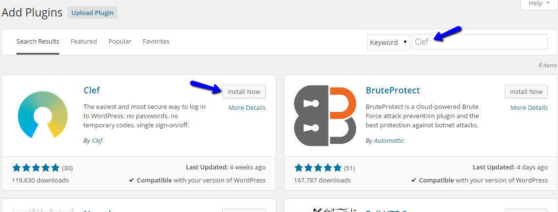 In the search-bar at the top-right corner, search for Clef and hit the Enter key on your keyboard. The system will search for plugins matching the criteria and then display them for you. Click on the Install button to proceed further with the Clef installation.