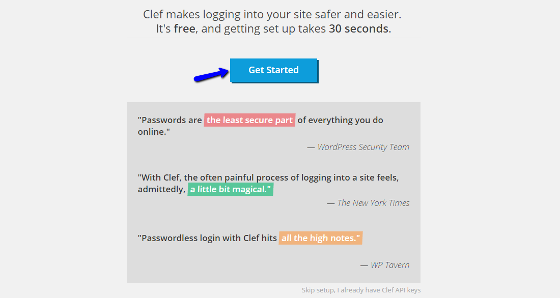 Click on the Get Started button to proceed further with the Clef configuration on your website.