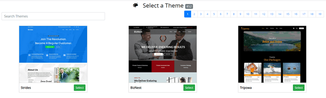 Now, you need to select a theme for your website. There are hundreds of them, so you can use the search bar to look for the specific motif you need. When you have found a theme you like, click on Select. If you want to change your theme later you can easily do that from the dashboard of your website. In the Interface Overview part of this tutorial we touch on that subject.