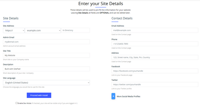 Next, select the domain you wish to use for the website. Remember that the domain must be hosted with our services for you to use it to create the website. Aside from that, you can also specify a subdirectory for the website to reside in if you wish. Then, input the Admin Email, Site Title, and Description, and select your website’s language. Finally, feel free to fill in the fields on the right as well, but they are not mandatory. There is also a Dev Mode option you can tick, but only do that if you want your website to be visible only when logged in. When ready, click Proceed with Install.