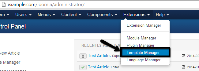 This tutorial will review the process of editing the style of your Joomla default template. To achieve that, you need to log into your website as administrator and navigate to the Extensions tab and then Template Manager.