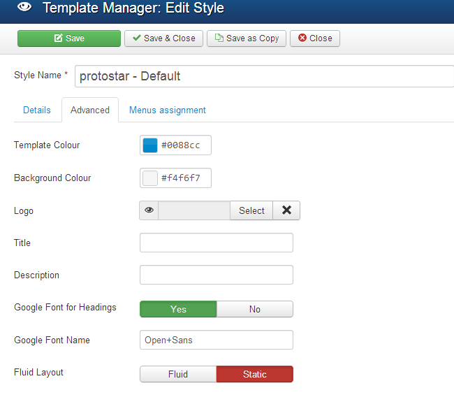 You will be presented with a number of options, depending on how the template is developed. Newer templates will provide a variety of options here that you will not find with the default Joomla templates. However, for the purpose of this tutorial, we have used the Protostar template, which comes with the default Joomla 3.x installation.