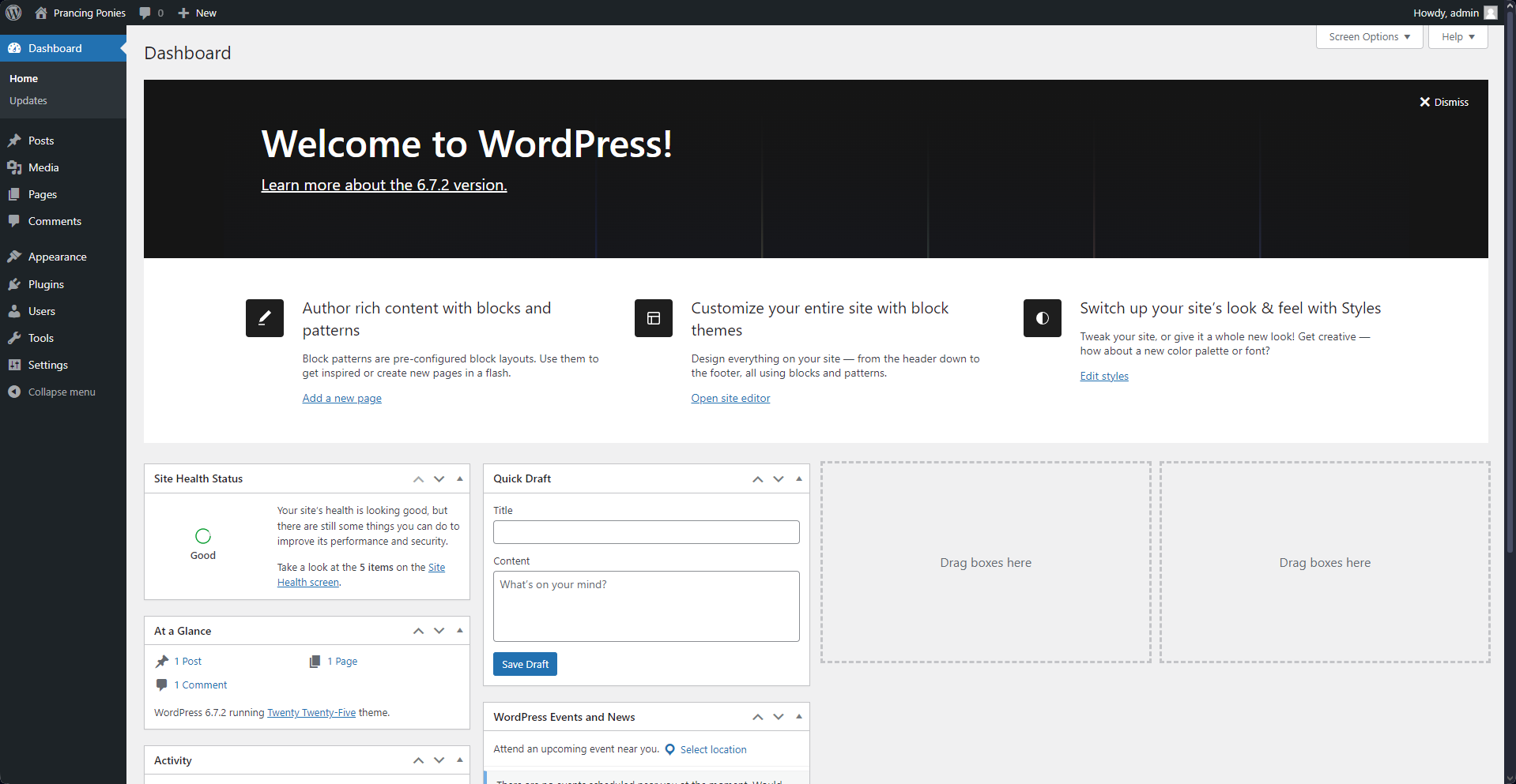 That is what the dashboard of a brand-new WordPress installation looks like. If yours looks differently, you most likely have plugins or themes that change its appearance. As you can see, the main part of the screen is taken up by a banner showing the site's version and multiple quick-access options. You have buttons for creating a new page, opening the site editor, editing styles, the Site Health screen, quick drafting, and more. At the top of the page, you will see two drop-down menus: Screen Options and Help. The former will let you customize this home page, while the latter will be your trusty companion throughout this dashboard. Click it on any dashboard page and find a link to that section's official documentation.