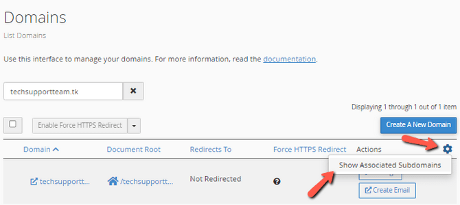 If we return to the WP Toolkit, the warning will still be there. That is because the Toolkit also recommends that forcing HTTPS also be enabled. To do this, return to the Domains tool, where you added the domain initially, and then click on the cog. Afterward, click Show Associated Subdomains.