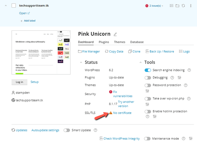 If we go back to the WP Toolkit, we will see that the SSL/TLS warning is no longer there and has been replaced with a reassuring green padlock. That signifies the WP Toolkit cannot find any issues with the SSL of the domain and the website.