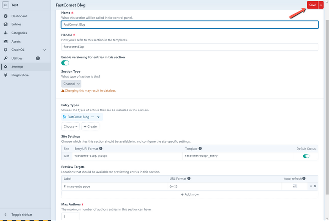- Max Authors - Finally, you can input the maximum number of authors the Entries of this Section can have.