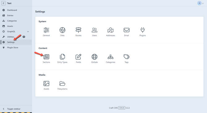 Now that you have an Entry Type, it is time also to create a new Section. Go back to Settings and click on Sections.