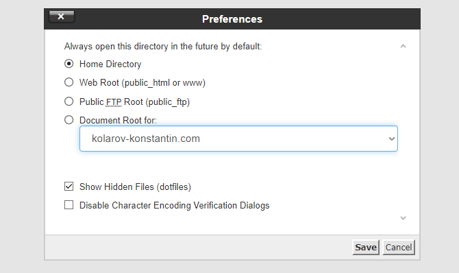 When you open it you will see the cPanel File Manager interface. On the left side of your screen you will see the directory tree of your hosting account and on the right side will be the content of your current folder. Additionally, you will see your home directory. In cPanel it is usually /home/username where username is replaced with the actual name of that cPanel account. Keep in mind that that entire path (/home/username) is your "home" (root directory). So, when moving or copying files, all you need is a slash ( / ) to start your path. Here is an example with moving a file to the public_html directory that is in the "home".