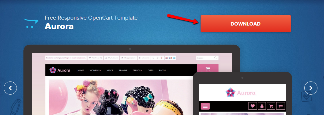 The first step of the process is to review all of the available themes and locate the one you will match your needs. Then, you can download the free OpenCart theme by clicking on the big Download button at the top right corner of the themes's page. For the purpose of this tutorial, we will install the Aurora OpenCart theme.