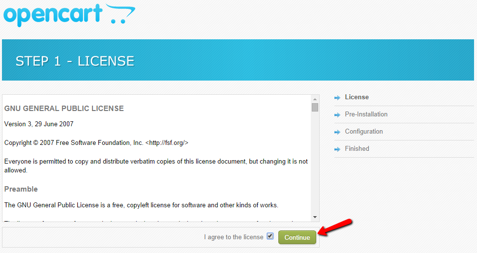 The first step will display the License agreement for the use of OpenCart. You will have to read it and then tick the I Agree To The License checkbox to proceed.