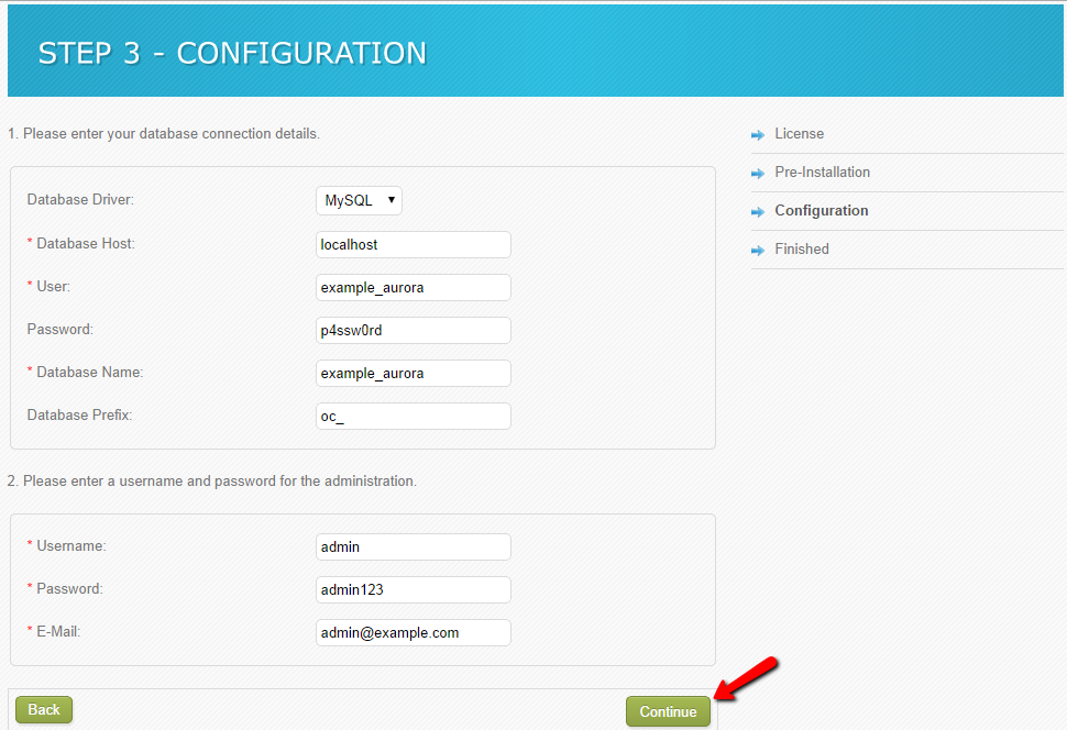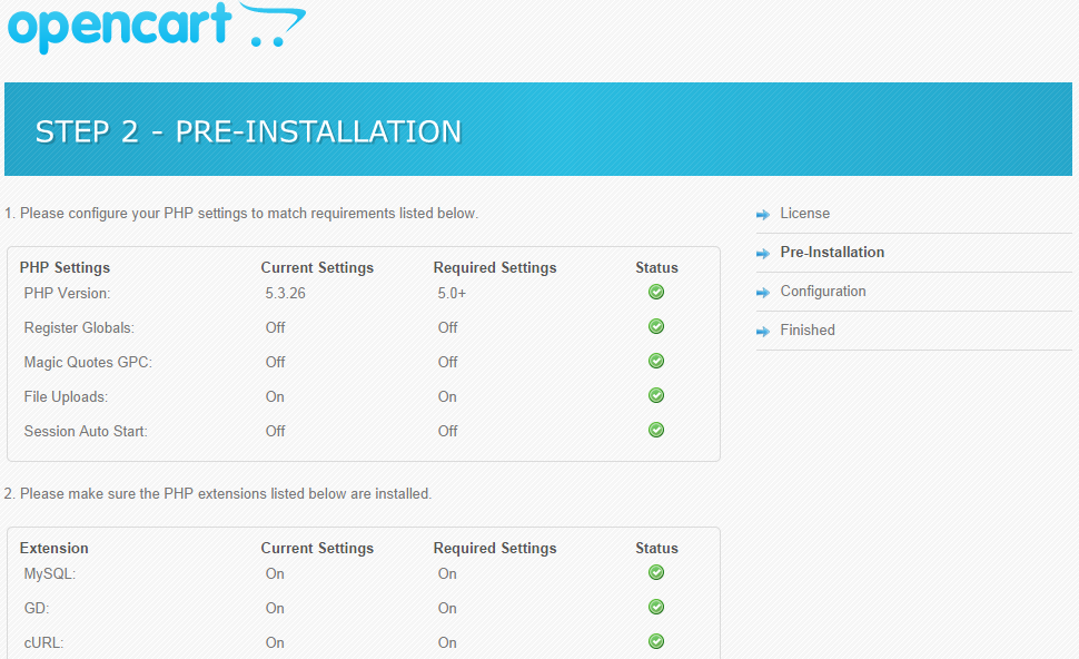 The second step of the process will check if the hosting server matches the minimum requirements of an OpenCart installation. As FastComet servers are fully optimized for OpenCart, you will not have any warnings here and you can safely proceed to the next step.