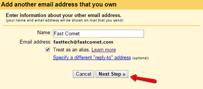 After the page in the pop-up window load, confirm the name of the email account that will appear in the "From" details and press the Next Step button. The "Treat as an alias" option can be set in order to manage "Send mail as" account behavior.