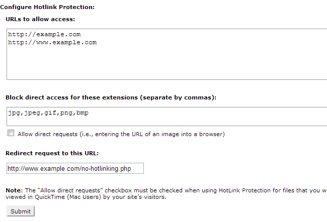 When you complete the setup of the hotlink protection service, don't forget to click on the Submit button to keep and apply the changes.