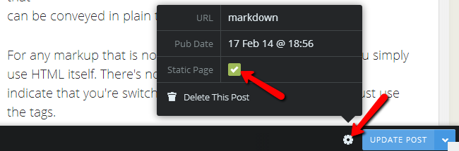 Your post should be properly displayed on your Ghost blog now. In case you would like to convert this post into a page, please click on the settings icon on the right bottom of your post page and tick the Static Page box.