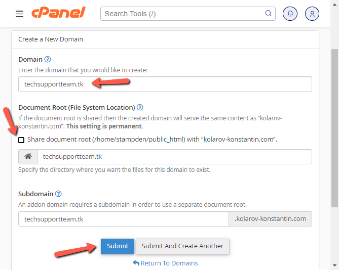First, you must ensure that the domain you wish to install WordPress on was added to your cPanel account. You can check that using the Domains tool in cPanel. If the domain is absent, it can be added by clicking Create A New Domain. Afterward, write the name of the domain. Then, untick the Share Document Root box. Otherwise, the domain will be assigned to the directory of the Primary Domain of the cPanel account. That is not good if you want the website to be a separate entity. Finally, click on Submit.