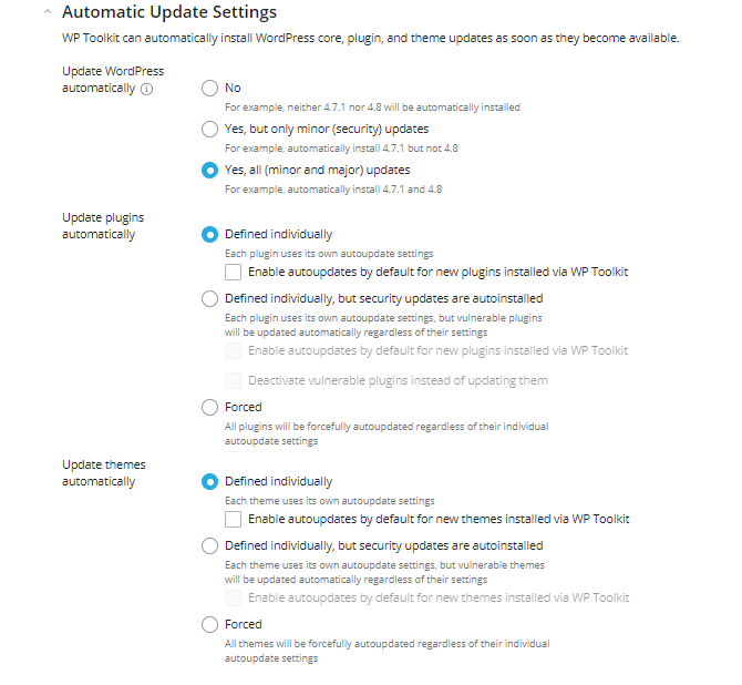 That is also an essential installation step, as it will dictate when the WordPress core files, plugins, and themes update. For instance, as can be seen in the screenshot above, the default settings are that the WP Toolkit will automatically update the core files of your website but will not do that for its plugins or themes. That means whenever a new version of WordPress is available, the WP Toolkit will perform the update on its own. That is immensely handy! Plugins and themes, on the other hand, will not be updated automatically by default. If you would like to turn on automatic updates for them, you can either do it in this step or later on via the administrative dashboard.