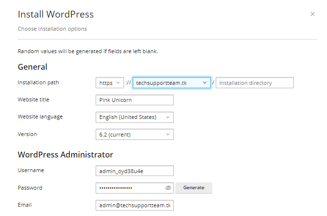 As the name suggests, these fields are the general options for your website: the domain that the website will be installed on; the directory it will be installed in; and its Title, Language, and WordPress Version. These are just the installation's first steps, but they are essential. Please be sure you set them up correctly.