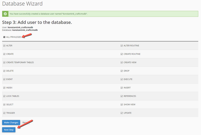 Finally, tick All Privileges and then click Next Step.