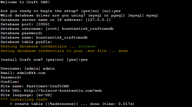 However, you can replace "fastcomet-craftcms" with anything you wish, as that will be your project's name and directory. We recommend you do that in the public_html directory (or any other that already has a domain pointed to it) so that you can easily access your website online. Then, the command will download Craft CMS to the directory and then prompt you to install it.