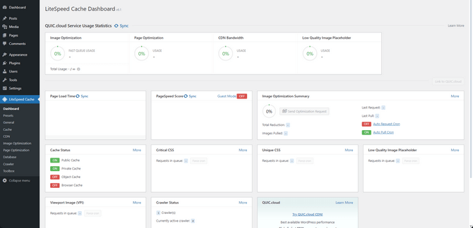 - QUIC.cloud Service Usage Statistics - As the name suggests, you will find all the usage statistics if you have connected your website to QUIC.cloud. If you are unfamiliar with it, it is a CDN service, like CloudFlare. QUIC was explicitly created for WordPress by the LiteSpeed team, so it is vastly more optimized for the CMS than CloudFlare is. This section is a simplified version of QUIC’s dashboard;