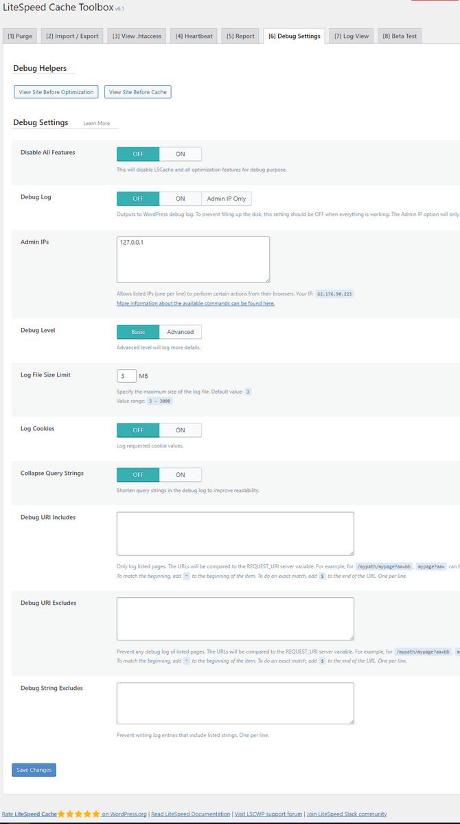The Debug Settings can allow you to view your website as if it is not being cached or optimized by the plugin. The two buttons at the top of the page can do those things for you. As for the other options below, here is what they all do.