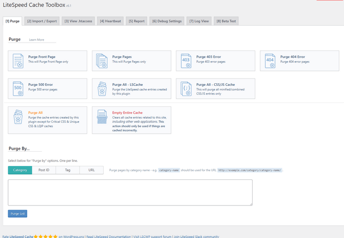 The Purge tab allows you to purge the cache from various parts of your website. Don’t worry. Just because it says Purge Front Page doesn’t mean it will delete it! Each button clearly explains what cache it purges, and you can even purge specific lists of pages.