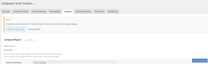 The Report tab will provide you with an environment report containing the settings you have enabled, what other plugins you have installed, and the contents of your .htaccess file, among other valuable things. Additionally, you can send this report to LiteSpeed directly if you require their assistance. Finally, you can generate a secure passwordless link so a support team member can safely log into your website’s admin and provide more personalized help.