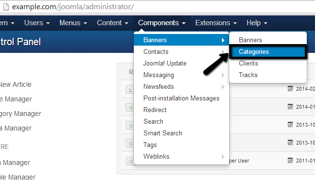 First, you have start by creating a Banner categories. Log into your website as administrator, navigate to the Components tab and then Banners → Categories.